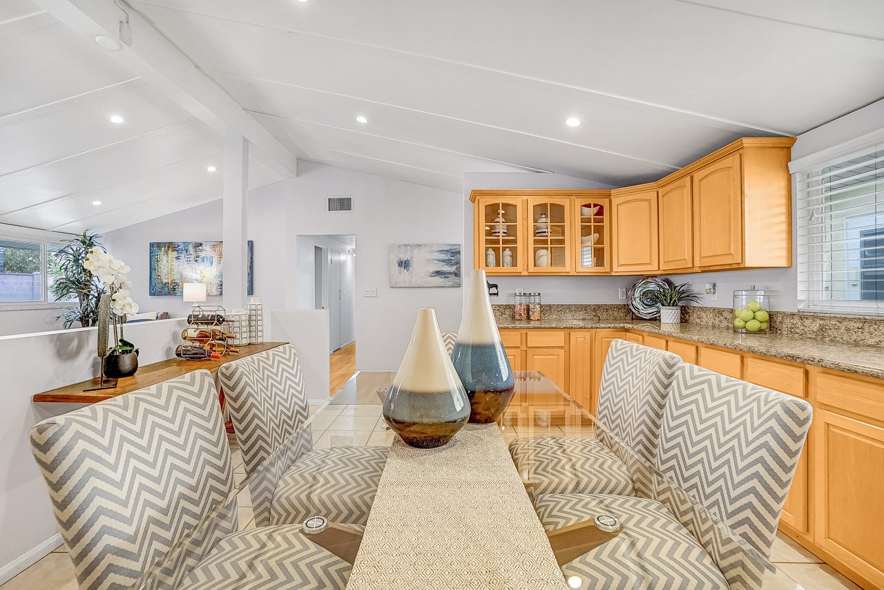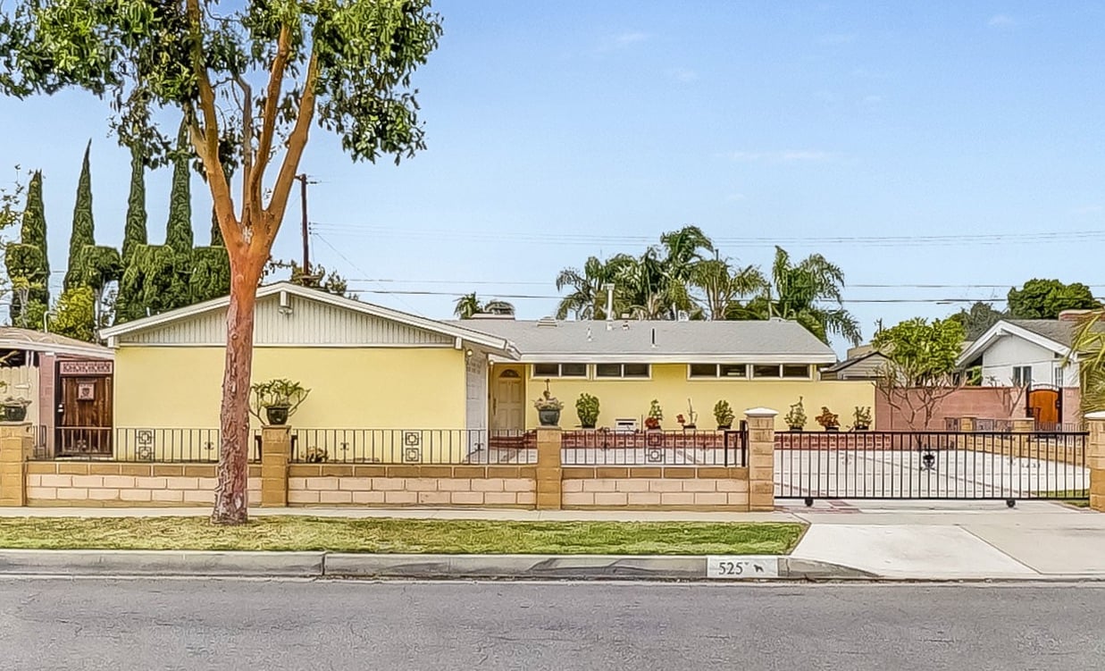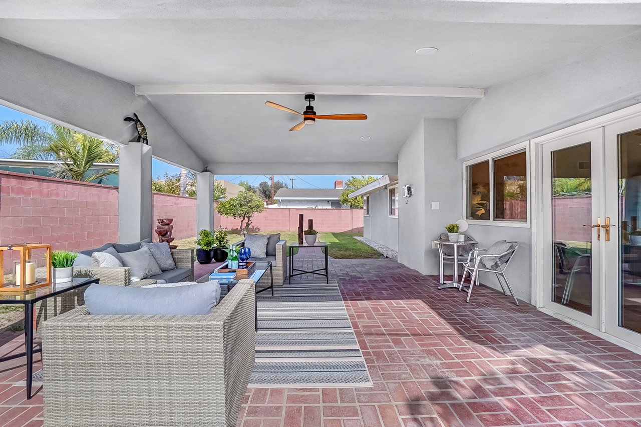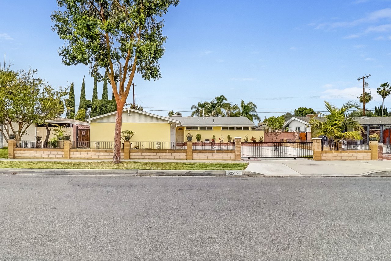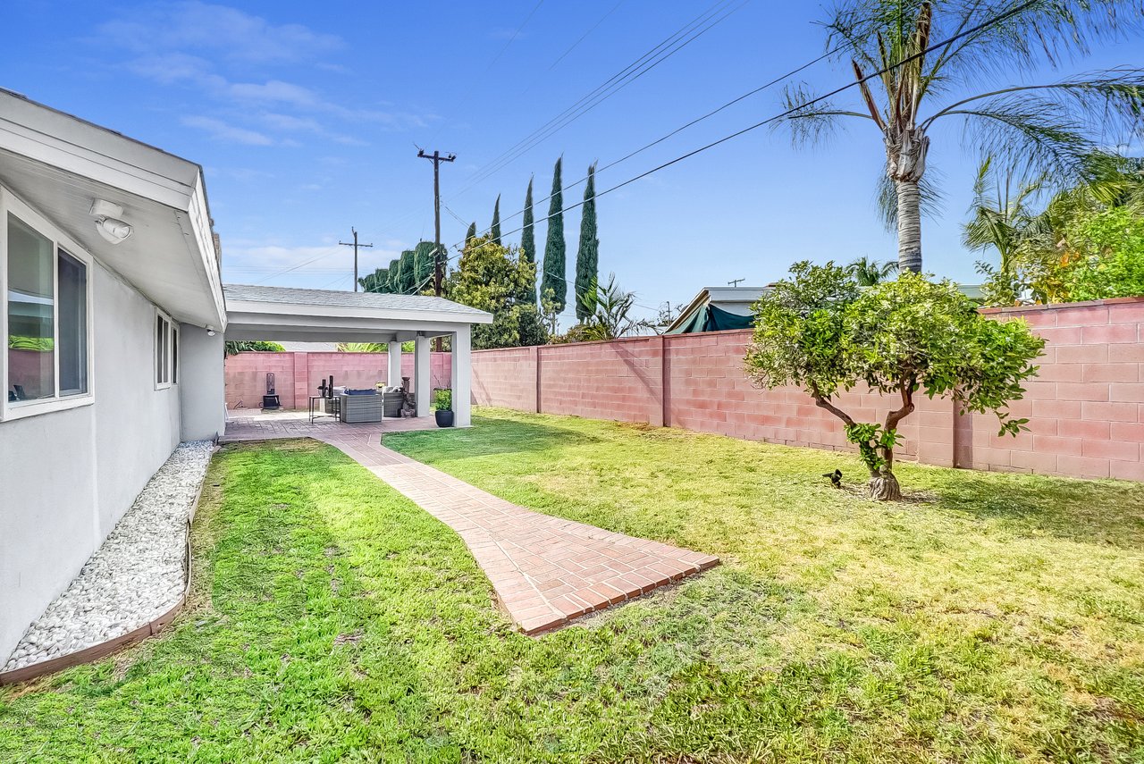 This charming home is recently renovated and move-in ready! The eat-in kitchen features long granite counters, tons of cabinet space, and a ceramic tiled floor. Vaulted ceilings and large windows are throughout the open concept kitchen/living room area that brings in great natural lighting to the house. While the living room boasts a classic gas fireplace and a corner office space with French doors that leads you out into the California room. The primary bedroom shines with high windows along the wall, perfect for letting the morning light in, and connects to a resort-style en-suite bathroom with delicate tile accents, a floating sink, and a walk-in shower with easy-to-maintain glass doors. Two additional bedrooms share a full bathroom with an extra-deep jacuzzi tub and double sinks to keep everyone happy. This chic bathroom will surely remind you of your favorite 5 stars hotel. The oversized covered California room is waiting for you in the backyard with plenty of open grass space. This is the perfect backyard to entertain family and friends all year round. The front of the home offers an extra-wide fenced-in driveway which is great for a big family with multiple cars and RV parking. Located nearby Costco, Target, shopping centers, restaurants, and Disneyland. The opportunities are endless, from a family home to a rental home, this charmer is a must see!!!