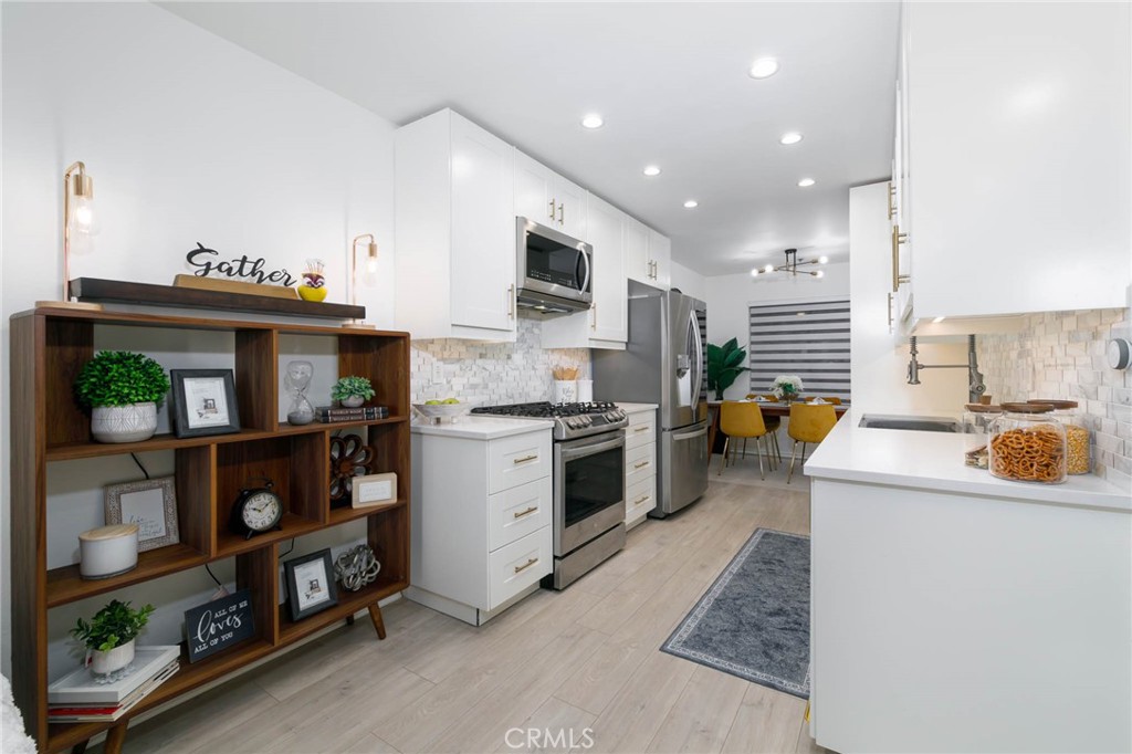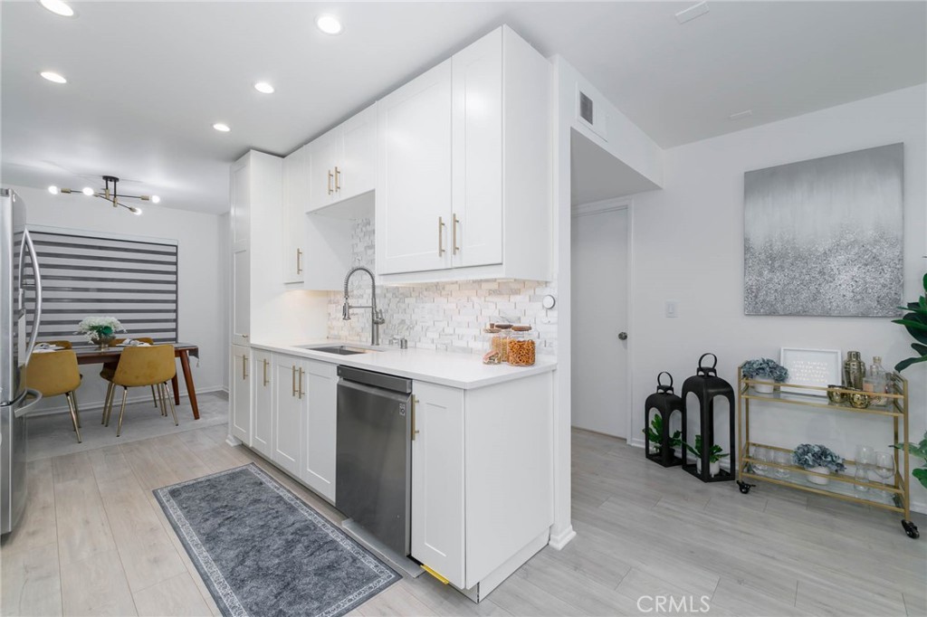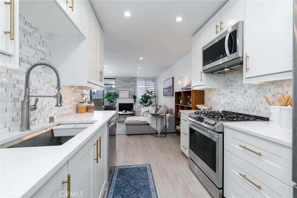 The renovated kitchen boasts new soft-close shaker cabinets, quartz countertops, a sleek tile backsplash with gold accents, and matching stainless steel LG appliances, including a French door refrigerator. Throughout the home, you'll find all-new recessed lighting, updated flooring, and a spacious living room with plenty of natural light. Control your home's temperature remotely with the smart Ecobee thermostat.