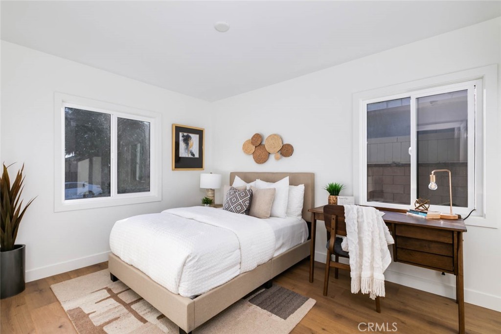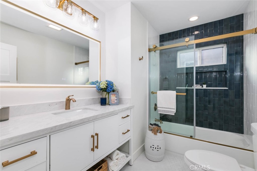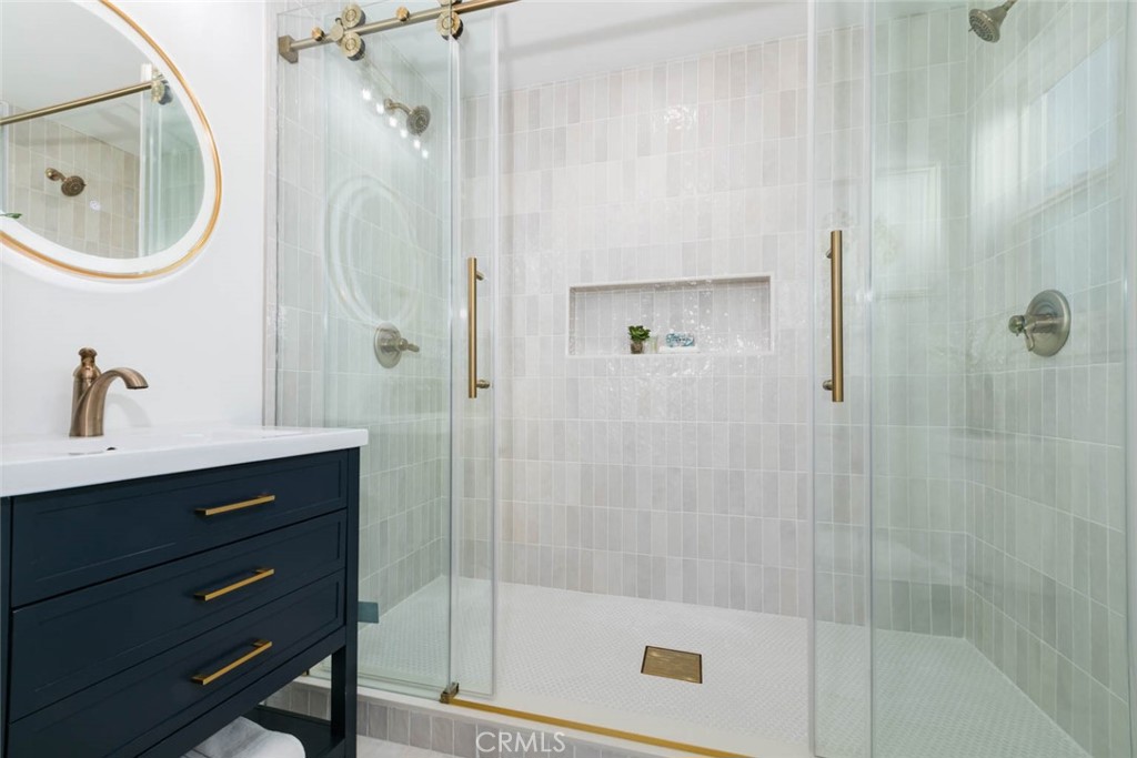 Both bathrooms have been thoughtfully remodeled to mirror the home's elegant design, with champagne bronze fixtures and LED mirrors adding a touch of sophistication. The ensuite primary bedroom is a peaceful retreat, featuring a large window with views of the backyard and a spa-like bathroom with an oversized shower, complete with double shower heads.