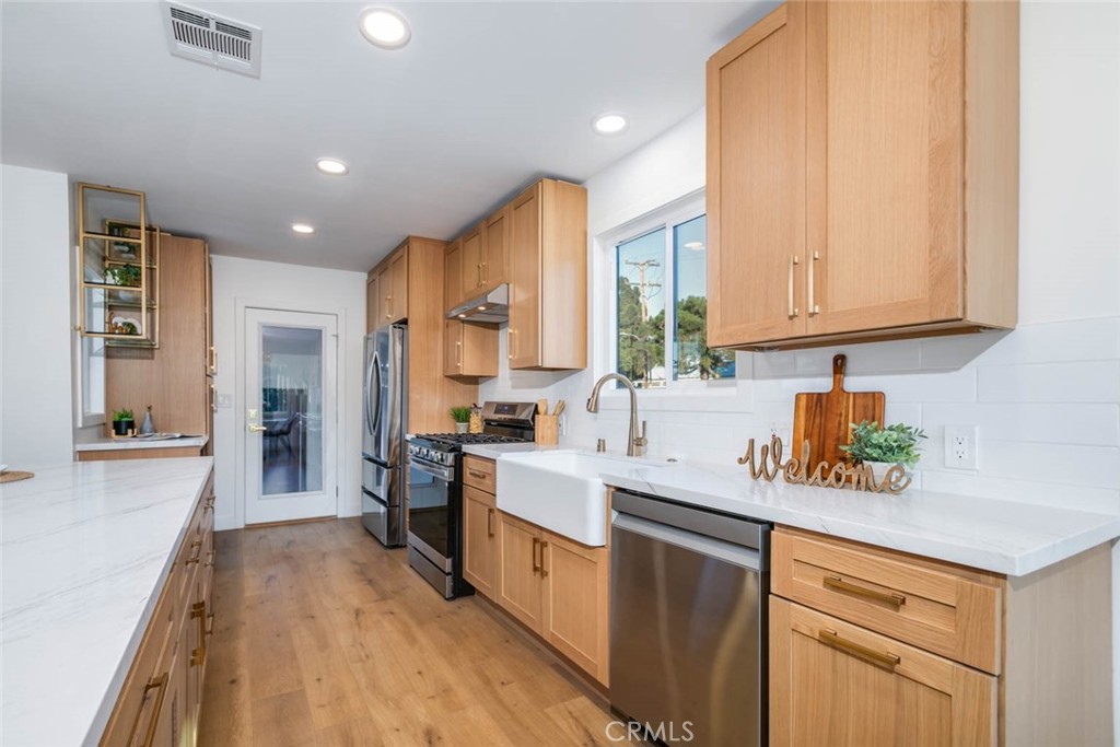 The kitchen is a showstopper, featuring brand-new appliances, soft-close cabinetry, elegant quartz countertops, champagne bronze fixtures, and eye-catching glass floating shelves that elevate the entire space. Recessed lighting with halo night lights creates a warm, welcoming ambiance throughout the main living areas and primary bedroom, complemented by beautiful hardwood floors that extend from room to room.