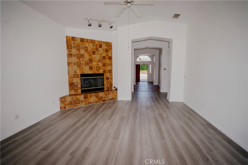 Step inside to find vaulted ceilings, a spacious living room with fireplace, and an open-concept kitchen with ample cabinetry, breakfast bar, and easy flow to the dining area. The primary suite includes a large walk-in closet, dual sinks, and direct patio access. Two additional bedrooms provide plenty of space for family, guests, or a home office.